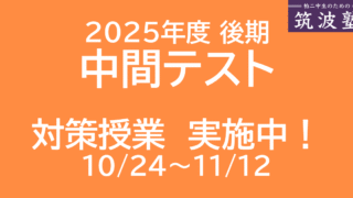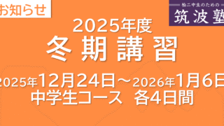 2025年度 冬期講習のお知らせ 2025年度、筑波塾初の冬期講習を実施いたします。冬期講習では、2025年後期授業の復習を演習中心に実施します。「筑波塾で予習→学校で復習→冬期講習で再復習」という流れで知識の定着と活用を強力にサポートします。冬期講習のポイント学校への提出... 2025.11.15