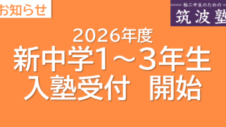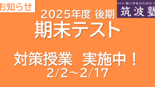 2025年度 後期 期末テスト対策を開始しました 柏二中より、2026年度後期の期末テスト範囲が公表されました。これを受けて、柏二中生のための筑波塾では期末テスト対策を開始しました。筑波塾では、通常授業から教科書に完全準拠した授業を行い、提出課題となる学校ワークも通常授業で進めています。そ... 2026.02.02
