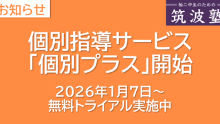 個別指導サービス「個別プラス」開始のお知らせ 筑波塾では2026年1月7日より、個別指導サービス「個別プラス」を開始しました。集団授業を基本としながら、必要に応じて個別指導を追加できるオプションサービスです。 集団の中で学ぶ力は、将来の社会生活に欠かせません。一方で、「わからないまま進... 2026.01.08